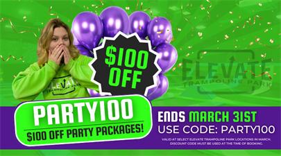 PARTY100 cannot be combined with any other discount. Valid at select Elevate locations. Valid March 1st - March 31st. PARTY100 must be used at the time of booking.